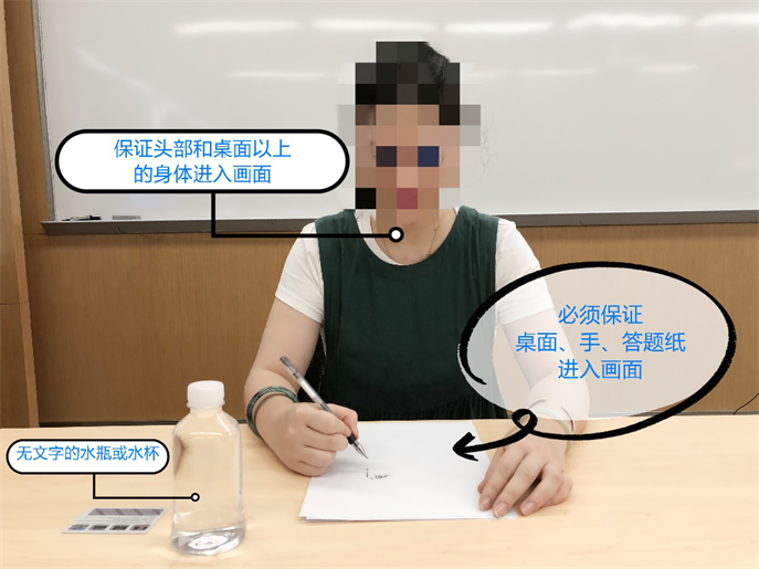 考生笔试时正对摄像头保持坐姿端正。双手和头部完全呈现在笔试专家可见画面中。笔试时清空笔试环境内与笔试有关的书籍、物品、人员。