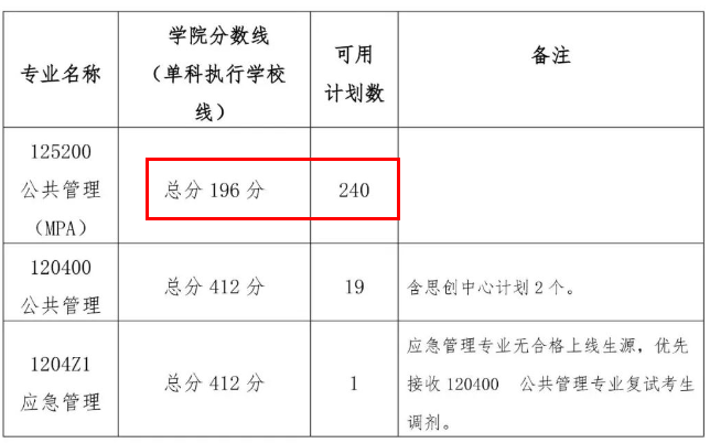 1.“二等功免试生”“少数民族高层次骨干人才计划”及“退役大学生士兵计划”按学校公布名单执行。2.对合格生源不足的专业,学院可对招生计划予以微调。复试采用现场复试方式进行。考生务必在来校报到前完成复试准备工作。1.复试名单、复试要求、注意事项等请查看学院主页-学生工作通知(http://www2.scut.edu.cn/spa/4857/list.htm)。2.进入复试名单的考生及时登录学校研究生招生系统下载打印复试通知书和现实表现复审表,根据系统要求提交本人身份证、学生证或毕业证等资格审查材料扫描件,并根据复试通知要求做好复试前相关准备工作。3.考生须密切留意学校及学院发布的相关信息,保持各类联络方式畅通。125200公共管理(MPA):2023年3月25日、26日125200公共管理 (MPA):广州市天河区华南理工大学五山校区北区博学楼4楼401室(面试报到)、402室(资格审查)、403室(资格审查)3.资格审查注意事项:审查符合条件者,方能参加复试。(2)应届生须持学生证、二代身份证、大学成绩单原件及现实表现复审(3) 往届生须持有毕业证、学位证、二代身份证、大学成绩单原件(或加盖档案单位红章的成绩单复印件) 及现实表现复审表。125200公共管理(MPA):3月25日、3月26日,地点是博学楼406室本次复试由电脑随机分配名单,分 4 批进行,详细复试分批名单请查看学院主页-学生工作通知的复试名单。请考生预留充分时间,不能更改复试批次,不按复试批次时间复试者视为自动放弃。请考生务必提前 30 分钟到达考试地点,根据考试安排凭本人身份证及复试通知书参加笔试。125200公共管理 (MPA):3月25日、3月26日,考生凭本人身份证及复试通知书在博学楼1楼查看随机安排的面试分组。请各类考生根据分组安排集中在候考室候考,集中候考期间考生不得中途离开,通讯工具全程集中保管。小组内考生面试顺序将现场抽取,请考生及时到场。面试期间,考生根据现场工作人员指引,依次到达面试考场,等待面试正式开始。面试结束后,携带本人全部物品,离开考试区域,不得在考场附近逗留,不得与候考考生交流。125200公共管理 (MPA)笔试考试内容为公共管理学,考试形式为命题作文,目的是考察考生的综合分析能力,特别是运用管理学、公共管理学的基本文,原理和方法分析公共管理的现实问题的能力,同时测试考生组织材料、分析论证和文字表达能力。考试内容重点在于对近期我国公共管理的现实热点问题或重要理论问题的分析,作文要求理论联系实际,言之有据:结构合理、层次分明,条理清晰、文字通顺。时长为 2小时。时间5分钟。口语测试题由考生抽签作答,评委和考生进行口语交流,根据考生表现综合独立评分。本项测试与综合素质与专业知识考核同时进行。125200公共管理 (MPA) 考生现场抽取综合面试试题进行作答,此后评委和考生进行现场问答交流,评委根据考生表现综合独立评分。125200公共管理 (MPA)考生还需进行思想政治理论考核,题目如下:2023 年1月,广东省高质量发展大会在广州举行。大会指出,面对百年变局的外部环境,广东如何化危为机、行稳致远;面对新一轮科技革命和产业变革深入发展,广东如何抢占先机、赢得主动;面对转变经济发展方式、优化经济结构、转换增长动力的重要关口,广东如何率先突破、示范引领;面对推进中国式现代化新的更高要求,各地各单位的思考谋划是否切合实际,工作的体制机制是否科学可行;这些的关键就在于我们推动高质量发展的谋划、担当与作为。请结合您的工作实际,谈谈你对此材料的理解。字数 3000 字左右。请于复试当天在面试候考时交给候考室(博学楼405 室) 老师,逾期提交等同考核不合格,考核不合格者不予录取。抄袭、代写视为作弊。试卷纸格式将于公共管理学院官方网站[学生工作通知]栏发布 (http:/www2.scut.edu.cn/spa/4857/list.htm)复试成绩=思想政治理论考核成绩X10%+专业课考核成绩X30%+综合素质与专业知识考核成绩X50%+外语听说能力测试成绩X10%(四舍五入,保留2位小数)总成绩=初试成绩X60%+复试成绩X40%X3(四舍五入,保留2位小数)其中,“二等功免试生”初试成绩以满分计算。1.3月31日起,考生通过我校研究生招生系统查询本人复试成绩、总成绩及排名。考生对本人成绩如有异议,须在规定时间内以书面形式实名提出。2.拟录取考生名单确定后将在学院网站公示,公示时间3个工作日。120400公共管理1.3月29 日下午,考生通过我校研究生招生系统查询本人复试成绩、总成绩及排名。考生对本人成绩如有异议,须在规定时间内以书面形式实名提出2.3月30日上午,导师招生计划及导师联系方式将在学院网站公布,成绩排名在招生计划范围内的考生自行联系导师,进行师生双向选择。确定导师的考生请将经接收导师签字确认的师生双选表交到交 5 号楼 209 陈老师处,拟录取全日制考生同时领取体检表(带彩色小一寸照片一张)。请考生在3月 31日下午 16点前提交师生互选表。3.3月30日下午14:30-16:00,考生凭体检表到校医院体检中心参加体检。体检完成后考生将加盖医院公章的复试流程表交 5号楼 209 陈老师。不参加体检或者体检不合格者不予录取。新生入学后将进行体检复查,若有弄虚作假者取消入学资格。4.拟录取考生名单确定后将在学院网站公示,公示时间3 个工作日1.录取工作按照公平、公正、公开、科学的原则进行。2.按专业考生总成绩从高到低的