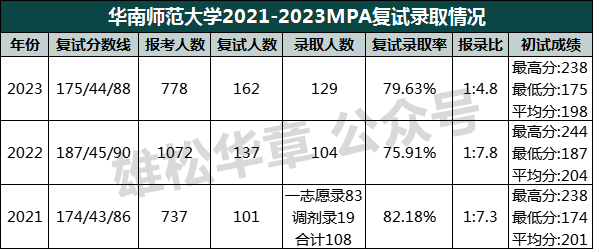 2. 政治与公共管理学院2023年硕士研究生复试安排 3. 政治与公共管理学院2023年硕士研究生复试科目考试大纲[190,300):60人录取55人,录取率91.7%;[185,190):17人录取10人,录取率58.8%;[180,185):22人录取16人,录取率72.7%;[175,180):17人录取9人,录取率52.9%。[190,300):32人录取28人,录取率87.5%;[180,185):4人录取4人,录取率100%;[175,180):6人录取5人,录取率83.3%。2)2023级招110人,拟录取总人数129人,广州90人,汕尾39人,复试分数线175/44/88,与国家线一致。拟录取名单中笔试最高分238分,最低分175分,建议初试分数低于190分报复试辅导班。