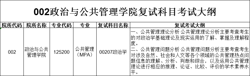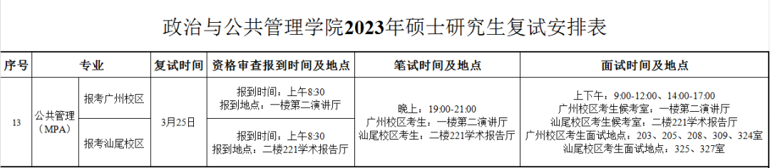 按照学校2023年硕士研究生招生复试录取工作通知的要求,政治与公共管理学院为做好本年度硕士研究生招生复试工作,本着公平、公正、公开的原则,特制订本方案。初试成绩符合第一志愿报考专业的国家A区初试成绩基本要求。我院按照1:1.8的差额比例确定复试资格名单,具体复试名单见附件1。MPA复试时间为:2023年3月25日,我院采用现场复试。详细的复试安排等相关要求,如笔面试时间地点如下:由我院对复试考生进行严格的资格审查,不符合报考条件或弄虚作假者不予复试。具体审查报到时间地点见上图。(2)学籍学历证书(应届本科毕业生提供学生证,其中自学考试和网络教育本科应届生提供主考院校或网络教育高校出具的相关证明,如本科成绩单或课程设置方案),持境外学历的考生须同时提交教育部留学服务中心的学历认证报告。(3)政审表(http://yz.scnu.edu.cn/ziliaoxiazai/)应届生考生由所在学院(毕业学院)签署意见并盖章。非应届生由所在工作单位或基层党组织开具,如无工作单位的,由档案存放单位开具。(5)学历认证报告(https://www.chsi.com.cn/xlrz/)或者教育部学历证书电子注册备案表(http://www.chsi.com.cn/xlcx/bgys.jsp)(往届生)(https://my.chsi.com.cn/archive/index.jsp )(应届生)(http://yz.scnu.edu.cn/ziliaoxiazai/)(http://yz.scnu.edu.cn/ziliaoxiazai/)普通高校应届本科毕业生:(1)(2)(3)(4)(6)(8);网络教育或成人教育高校应届本科毕业生:(1)(2)(3)(4)(6)(8),以及录取当年的录取名册复印件,加盖学校公章;往届毕业生:(1)(2)(3)(4)(5)(8);拟录取为定向就业的(包括应届生和往届生):还需要提交(7)。※上述各类考生需提交的材料的电子版按以上顺序原图彩色扫描或拍照,汇总成一个PDF文档,并务必于3月24日(周五)中午12点前发至政管研工办gw_002hszgxy@scnu.edu.cn电子邮箱。邮件主题:报考专业+考生编号(15位)+考生姓名+手机号码+提交复试审查资料;附件命名要求:报考专业+考生编号(15位)+考生姓名+手机号码(普通附件发送,不要使用中转站等临时附件形式以免超期)。所有提交材料的原件,于复试当天提交,无需提前邮送。※上述所有材料必须真实有效,现场复试考生复试时须携带原件查验。申请保留入学资格者必须提交保留入学资格申请书,经专业指导组及我院签署意见同意后报招生考试处备案。拟录取后再补提交的申请无效。按照教育部文件,参加“大学生志愿服务西部计划”、“三支一扶计划”、“农村义务教育阶段学校教师特设岗位计划”、“赴外汉语教师志愿者”等项目服务期满、考核合格的考生和普通高等学校应届毕业生应征入伍服义务兵役退役后的考生,3年内参加全国硕士研究生招生考试的,初试总分加10分并在同等条件下优先录取的政策。普通高校在校生(含高校新生)应征入伍服义务兵役退役,在完成本科学业后3年内参加全国硕士研究生招生考试的,初试总分加10分,同等条件下优先录取,在部队荣立二等功及以上,符合全国硕士研究生招生考试报考条件的,可申请免试(初试)攻读硕士研究生。参加“选聘高校毕业生到村任职”项目服务期满、考核称职以上的考生,3年内参加全国硕士研究生招生考试,初试总分加10分,同等条件下优先录取,其中报考人文社科类专业研究生的,初试总分加15分。加分项目不累计,同时满足两项以上加分条件的考生按最高项加分。按照华南师范大学2023年硕士研究生招生复试办法,符合复试加分政策项目的考生应及时与我院联系并提交相关证明材料复印件,由我院汇总提交给招生考试处审核。报考“退役大学生士兵”计划的考生,复试前需向我院提交本人的《入伍批准书》和《退出现役证》材料,入学后需提交本人的《入伍批准书》、《退出现役证》原件和复印件,我院审核并留存复印件。复试包括复试科目考核、综合素质考核两个部分,均通过现场复试进行。现场笔试作答,作答时间2小时。各复试专业复试科目、复试考试大纲如下表: