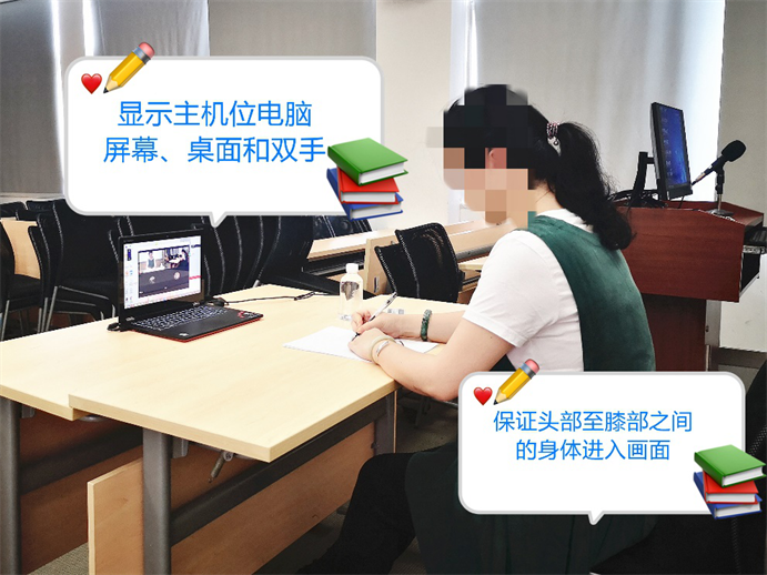 主机位电脑摄像头对准考生本人,辅机位设备摄像头从考生后方成45°拍摄。要保证考生考试屏幕能清晰地被监考员看到。双机位均需确保摄像头视角能看到考生考试的桌面和双手。