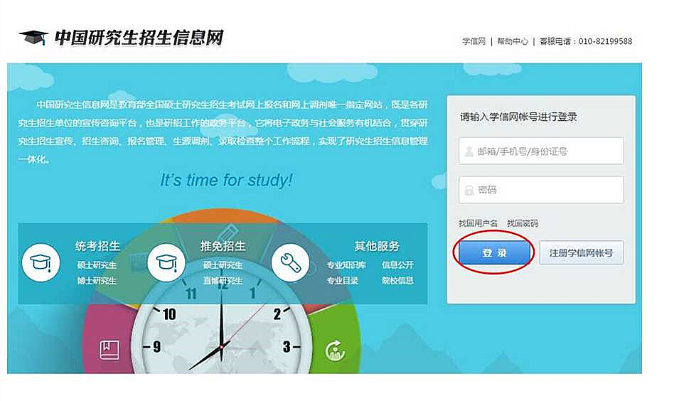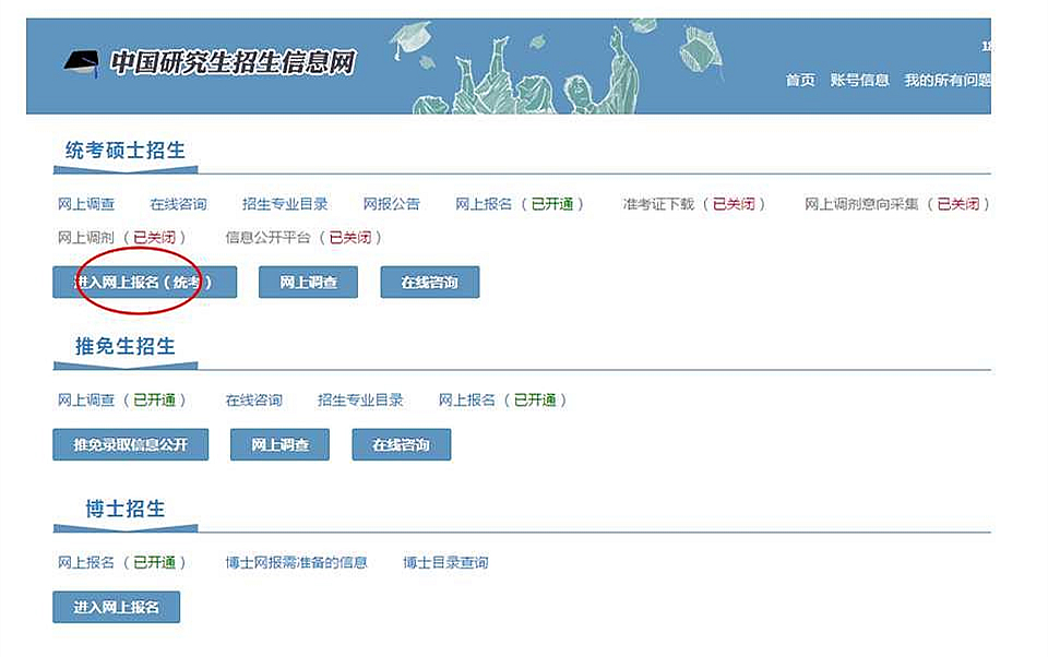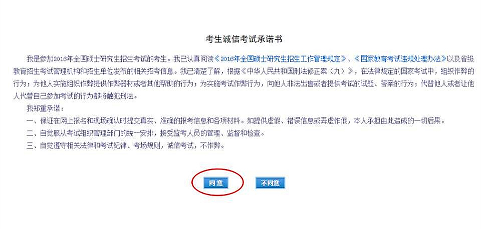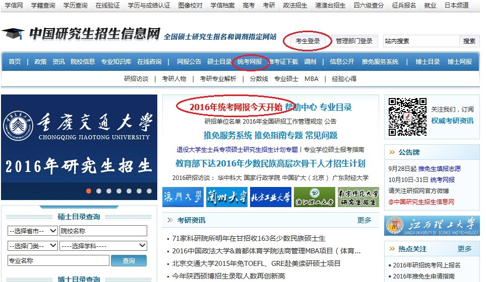 步骤1:登录“中国研究生招生信息网”(公网网址:http://yz.chsi.com.cn,教育网址:http://yz.chsi.cn),点击“2016年统考网报今天开始”、“统考网报”、“考生登录”均可进入报名页面;