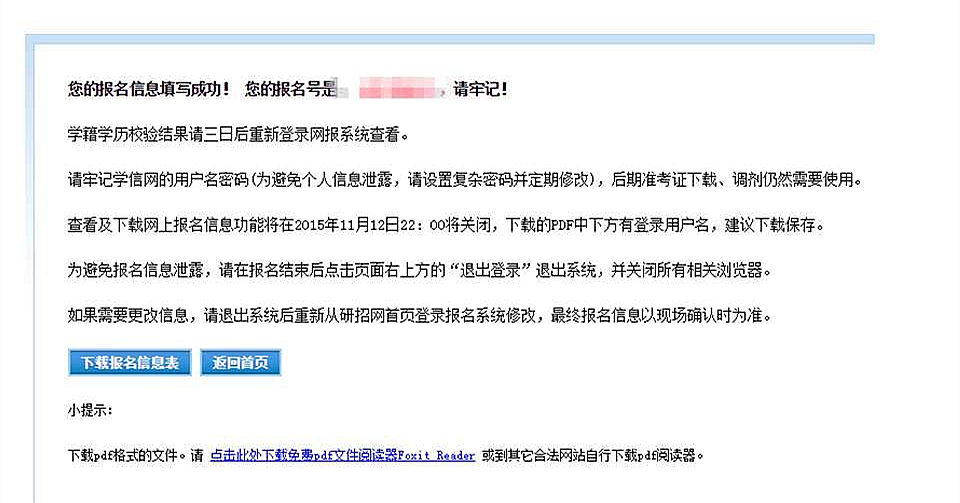 步骤 13:生成报名号,请务必谨记,现场确认需提供,下载报名信息表;