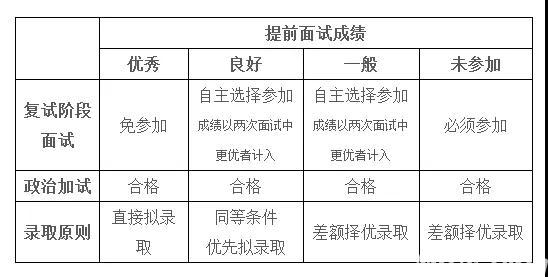 参加提前面试获得良好者,如联考成绩达初试分数线(含总分和单科分),可自主选择是否参加复试阶段面试(最终成绩以两次面试中更优的计入);政治加试合格,在同等条件下优先进入拟录取环节。