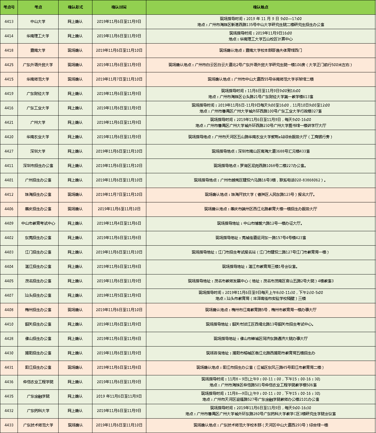 广东考点网上确认时间集中在11月6日至11月9日,各考点具体确认时间详见文末汇总图。